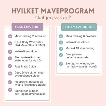 Flad Mave 40+ består både af fokuseret mavetræning, effektive fullbody workouts og kostjusteringer, der understøtter vores træningsindsats. Desuden får du grundig instruktion og masser af nyttig viden specifikt om sundhed for kvinder 40+. Flad Mave Online består "kun" af mavetræning og instruktion heri.